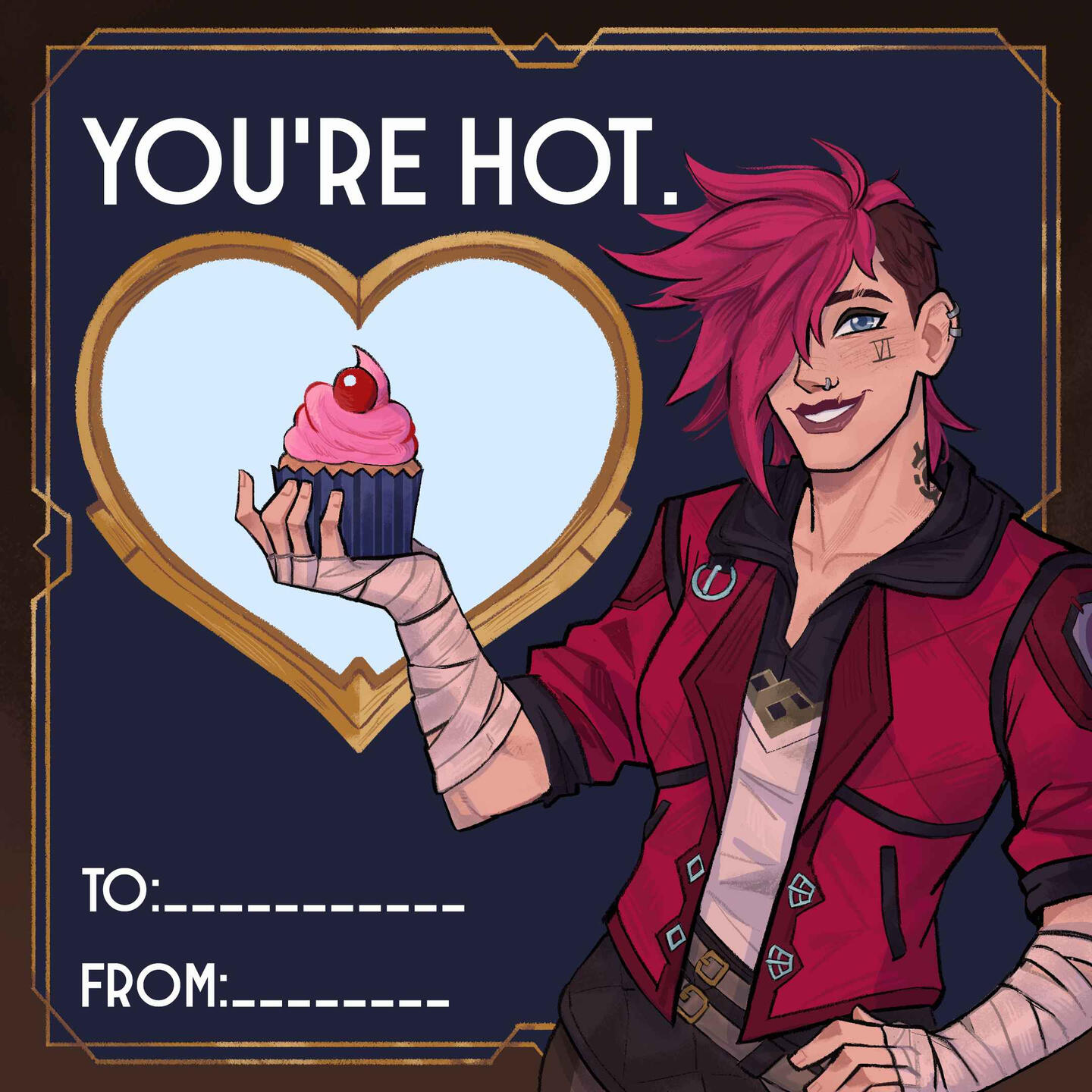 This was done in collaboration with Riot Games.I was tasked with making a Valentines Day card for Vi, specifically her look from their TV Series, Arcane.This was posted to the official League of Legends Twitter, Facebook, and Instagram accounts.