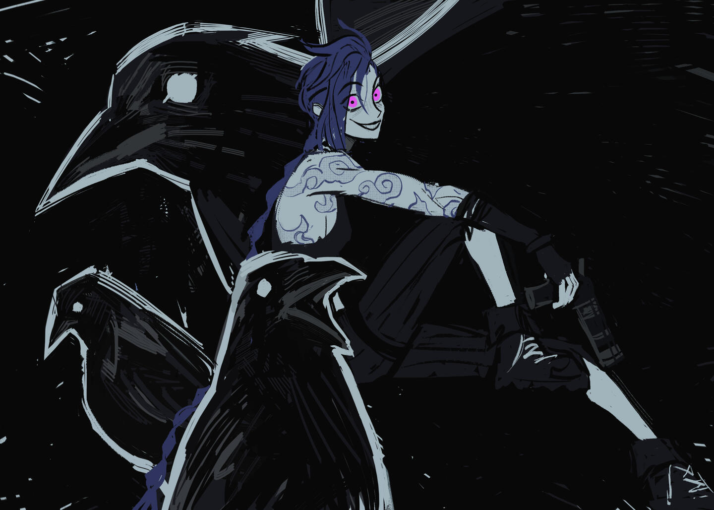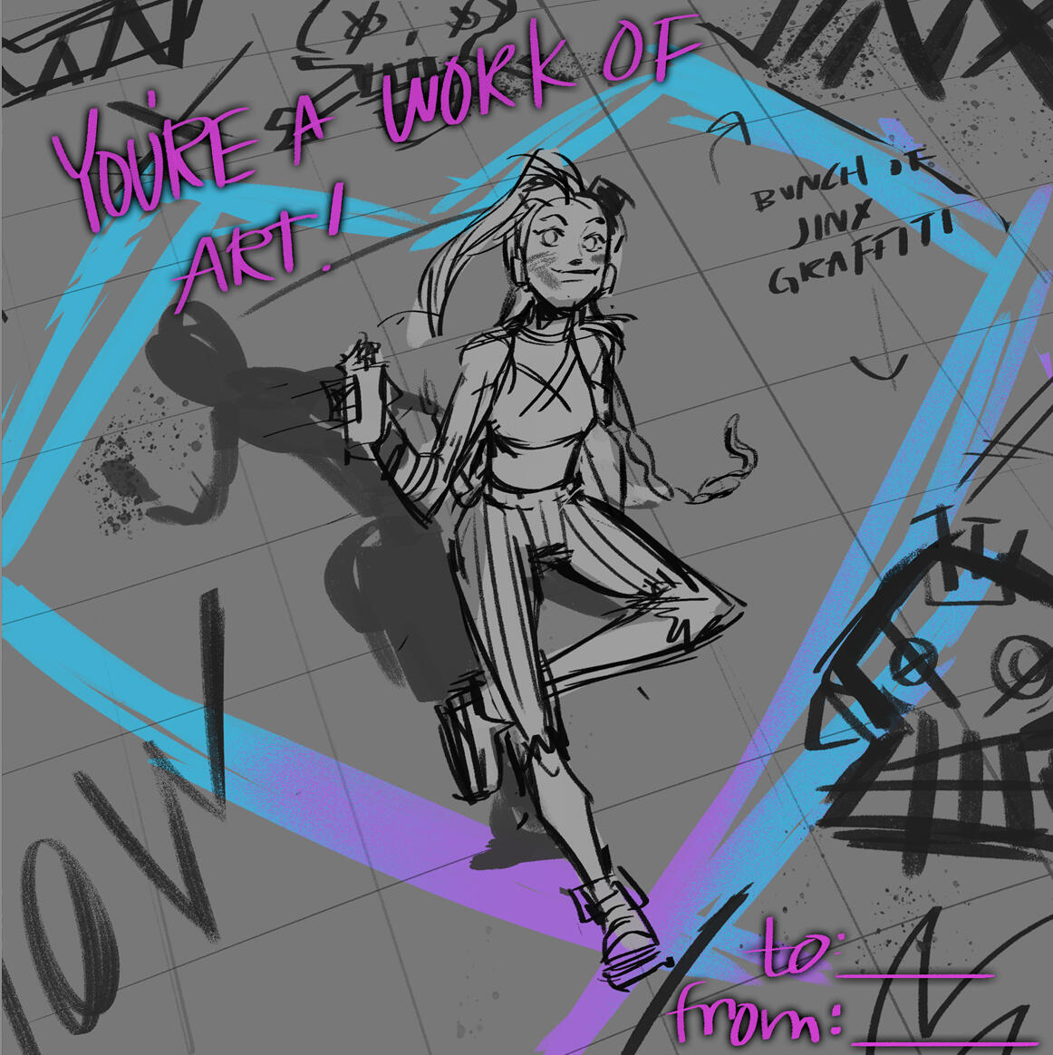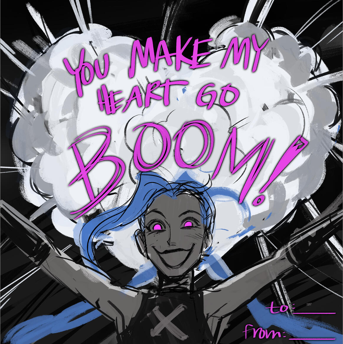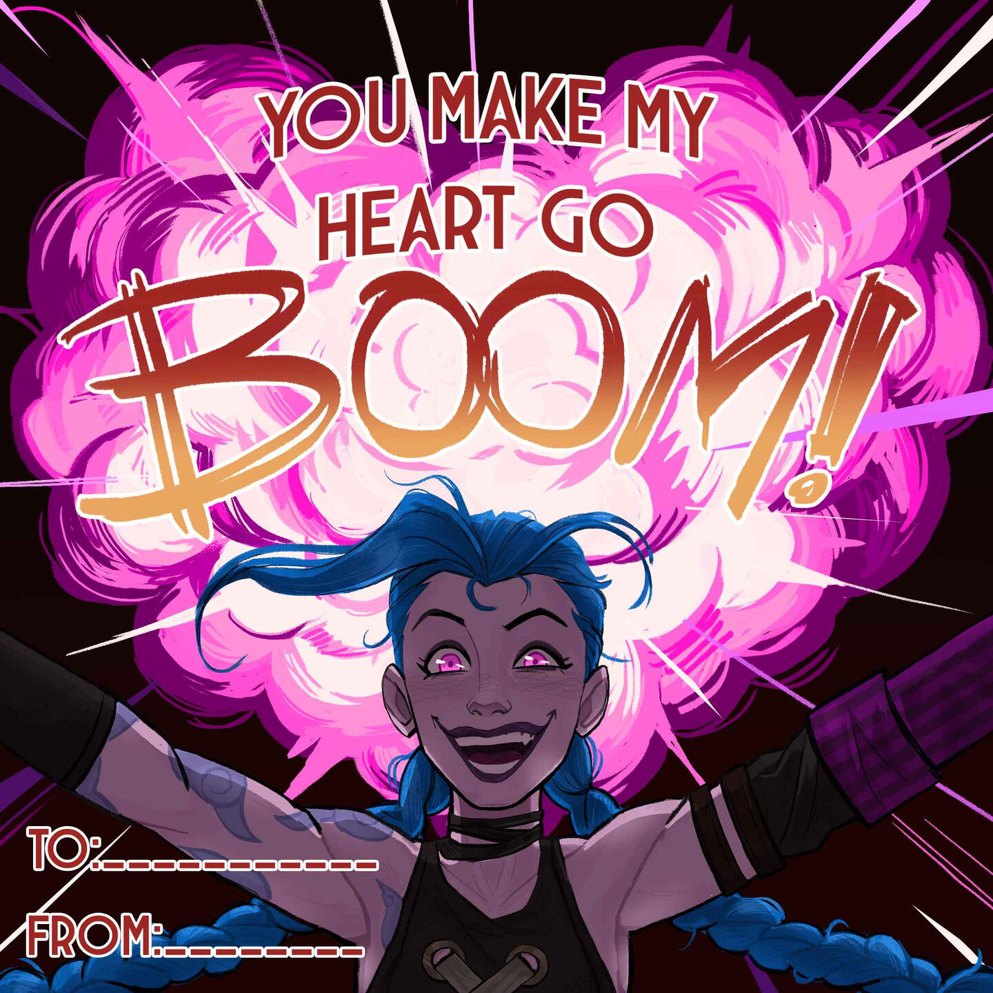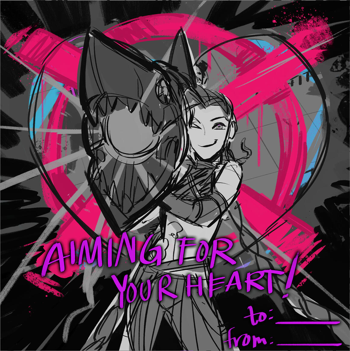This was done in collaboration with Riot Games.I was tasked with making a Valentines Day card for Jinx, specifically her look from their TV Series, Arcane.This was posted to the official League of Legends Twitter, Facebook, and Instagram accounts.
